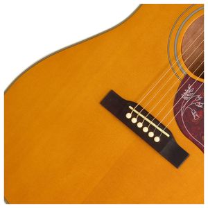 Strengene føres over en kompensert plast-sadel og forankres i en belly-up rosewood-bro med ivory-fargede bridge pins. Flere detaljer forsterker vintage-estetikken, blant annet en Hummingbird pickguard i tortoise shell-farge med ikonisk Hummingbird-grafikk, høykvalitets Grover® Rotomatic® stemmeskruer for presis og stabil stemming, samt et 60s Kalamazoo-inspirert headstock-design med Epiphone-logo og Gibson Crown innlagt i mother of pearl.